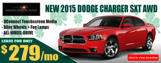 | New 2015 Dodge Charger SXT AWD. Lease for only $279/mo. Stock # 3526650. Pictures are for illustration purposes only and may not reflect actual sale vehicles. Payment quoted with $2999 cash or trade equity down plus tax, title and registration. All rebates to dealer. Lease payment quoted @ 36 months/10,000 miles per year. $1,000 competitive lease incentive applies. See sales person for details. For well qualified lessees. Sale ends 3/31/2015. |