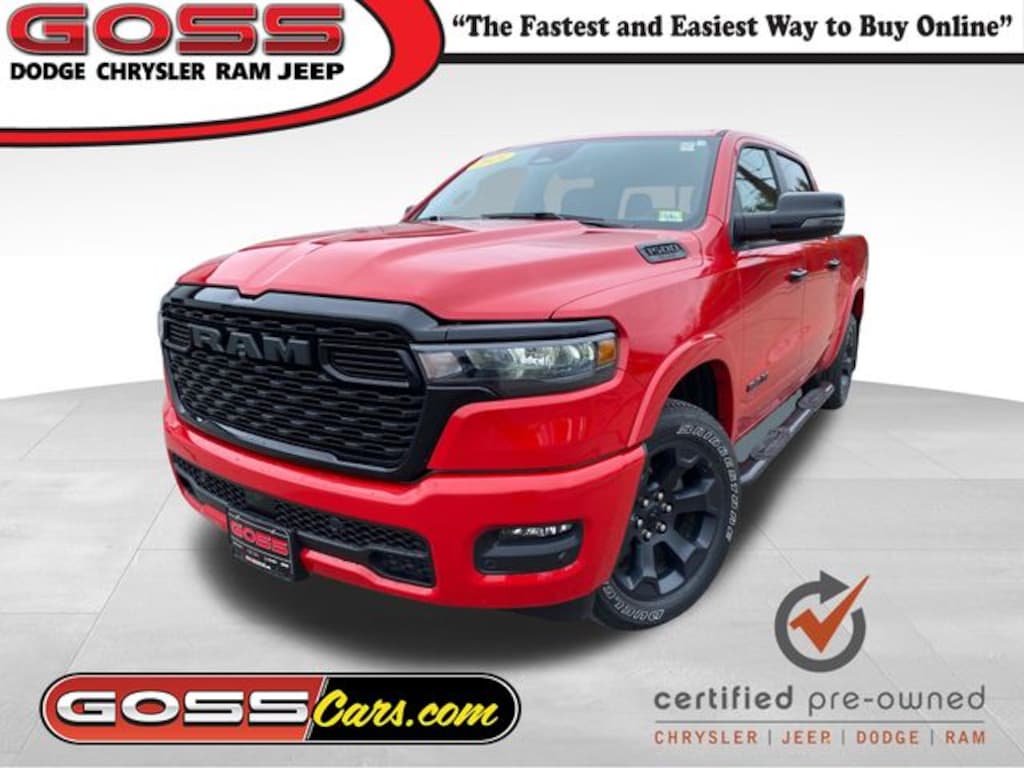 2025 Ram 1500 Big Horn/Lone Star Crew Cab, 4WD, 8-Speed Automatic, 3.0L I6, Flame Red Clearcoat, Chrysler CPOV 7 Year/100,000 Mile Warranty, ONE OWNER, CLEAN CARFAX, NAVIGATION, HEATED SEATS, 115V Auxiliary Power Outlet, 12" Touchscreen Display, 2nd Row In Floor Storage Bins, 4G LTE Wi-Fi Hot Spot, 9 Amplified Speakers w/Subwoofer, ABS brakes, Accent Color Door Handles, Accent Color Premium Power Mirrors, Accent Color Tailgate Handle, Air Conditioning ATC w/Dual Zone Control, Anti-Spin Differential Rear Axle, Apple CarPlay, Auto Power-Folding Mirrors, Auto-Dimming Exterior Driver Mirror, Auto-Dimming Rear-View Mirror, Big Horn Level 2 Equipment Group, Black Exterior Mirrors, Black Exterior Truck Badging, Black Headlamp Bezels, Black Interior Accents, Black Painted Exterior Mirrors Caps, Black Premium Power Mirrors, Black Tail Lamp Bezels, Body Color Front Bumper, Body Color Rear Bumper w/Step Pads, Cluster 7.0" TFT Color Display, Configurable Drive Mode, Convex Wide-Angle Exterior Mirror Insert, Deluxe Cloth Bucket Seats, Electronic Stability Control, Exterior Mirrors Courtesy Lamps, Exterior Mirrors w/Heating Element, Exterior Mirrors w/Supplemental Signals, Google Android Auto, GPS Navigation, Grille Black Surround Black Mesh, HD Radio, Heated Front Seats, Heated Steering Wheel, Integrated Voice Command w/Bluetooth, LED Dome Lamp w/On/Off Switch, LED Footwell Lighting, Night Edition, Overhead LED Lamps, ParkView Rear Back-Up Camera, Power 2-Way Driver Lumbar Adjust, Power Adjust 8-Way Driver Seat, Power Adjustable Pedals, Power windows, Radio: Uconnect 5 Nav w/12.0" Display, RAM Grille Badge - Black, Rear Power Sliding Window, Rear Window Defroster, Remote Tailgate Release, Security Alarm, SiriusXM w/360L, Speed control, Trailer Brake Control, Universal Garage Door Opener, USB Host Flip, Variably intermittent wipers, Wheels: 20" x 9.0" Aluminum Painted Clad.
